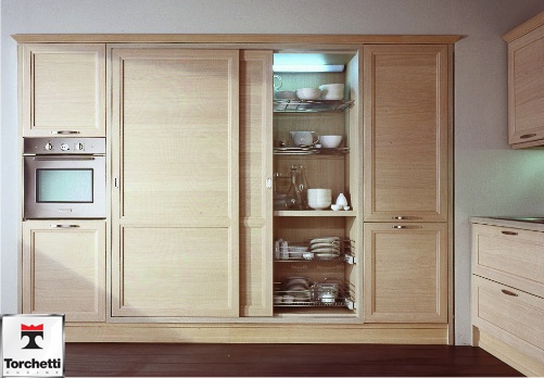 Set for the kitchen from Italian manufacturer Torchetti. The frame is made of solid wood. Finish to be selected from the range of the company. Handles lockers are made of metal. The tabletop is covered with stainless steel. The augmented model with built-in lighting. Headsets are made in a modern style. Different practicality and elegance.