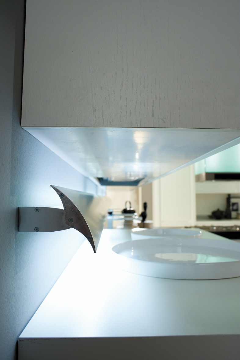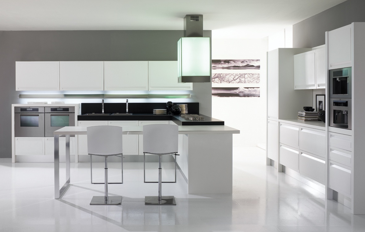Set for the kitchen from Italian manufacturer Torchetti. The model is made in modern style. The facades covered with glossy varnish. Color option - white. Fittings and legs made from chromed metal. Countertop made of natural stone or stainless steel. In addition there is built-in lighting and extractor fan. Convenient and practical set will fit the interior of your home.