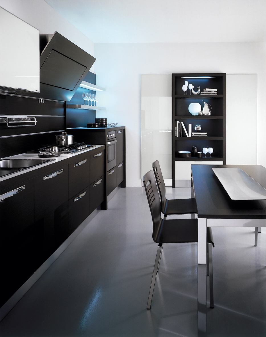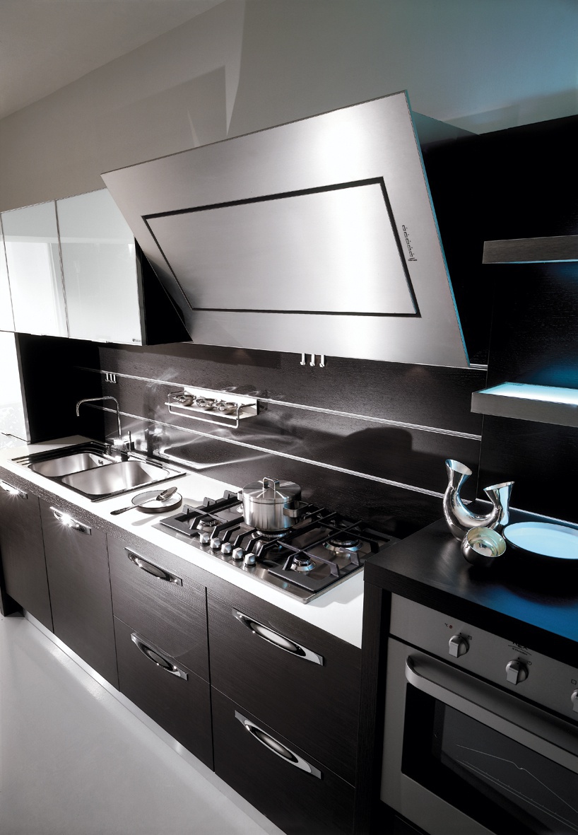 Set for the kitchen from Italian manufacturer Torchetti. The facade is made of solid wood. The lower part is covered with chrome metal. The glossy lacquer finish is offered from the company portfolio. Handles lockers made of metal. There is built-in backlight. The basic set can be supplemented by a dining table and chairs of similar design.