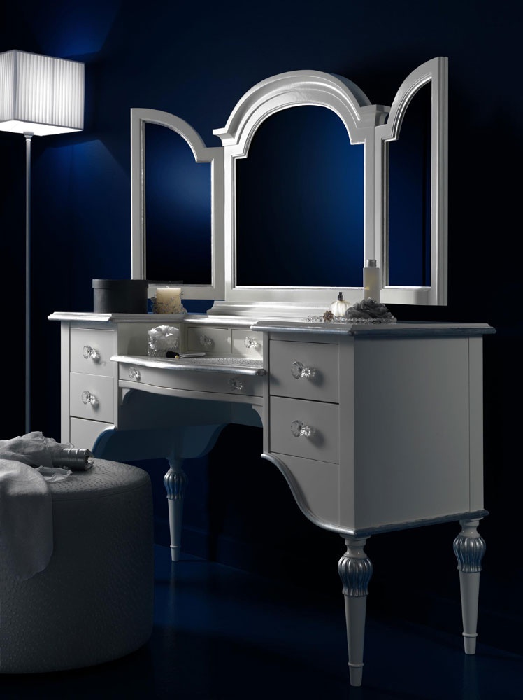 Dressing table with drawers of different sizes from the Italian manufacturer Zilio. The case is made of solid wood. Offered lacquer finish in white. Handle round shape made of transparent glass. The model can be supplemented with mirrors.