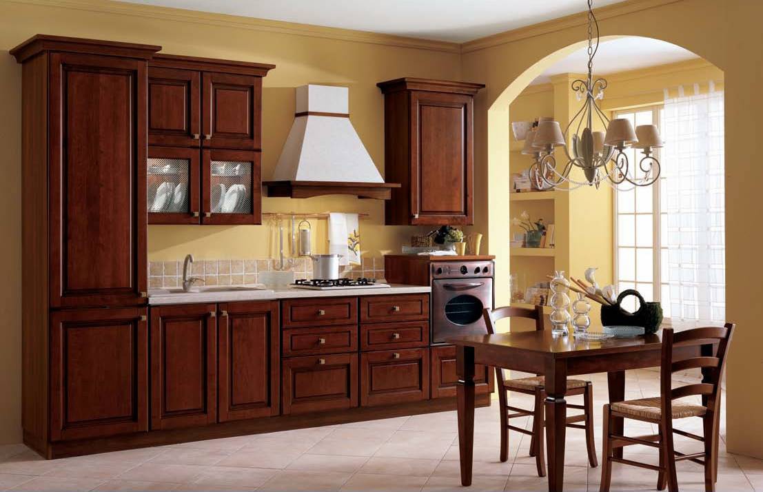 Set for the kitchen by Italian manufacturer Stosa. Set in a classic style. The furniture is made of solid wood. Options of countertop: marble, laminate, steel or glass. Fold - frosted glass. Finishing varnish from the range of the campaign. Chairs with upholstery. Set with built-in backlight. The color of natural wood products.