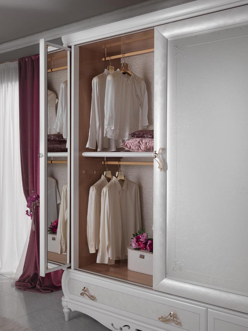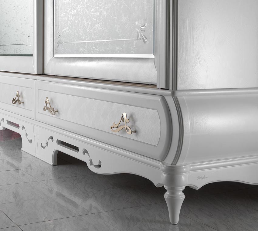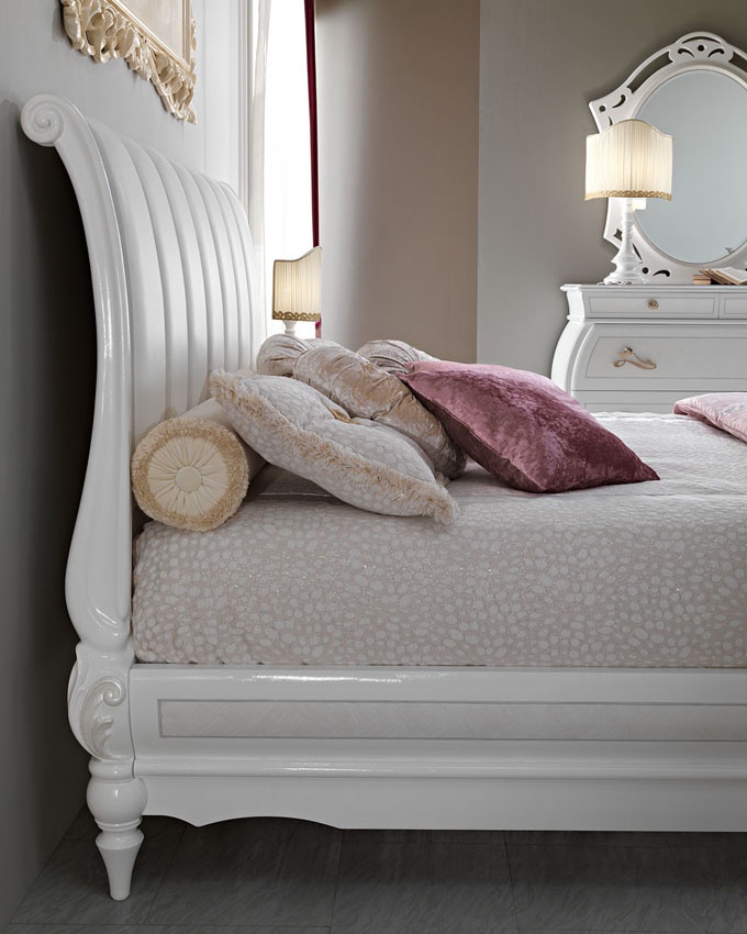 Headsets for bedrooms from Italian manufacturer Pistolesi. Set includes double bed with high headboard and a soft, bedside tables, wardrobe and chest of drawers. The furniture is made of solid wood of valuable breeds. Upholstery headboard - natural leather. Finishing varnish from the range of the campaign. D?cor - gilding. The design of complementary decorative pillows different shapes. Set is decorated with inlay. Fittings - gilding. Wardrobe with integrated mirror. The color of products is white.