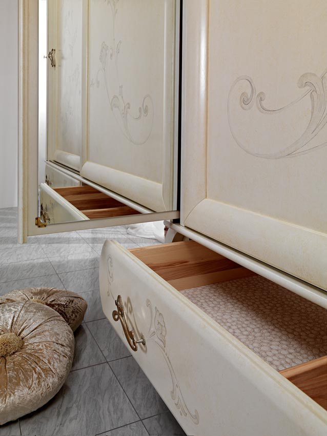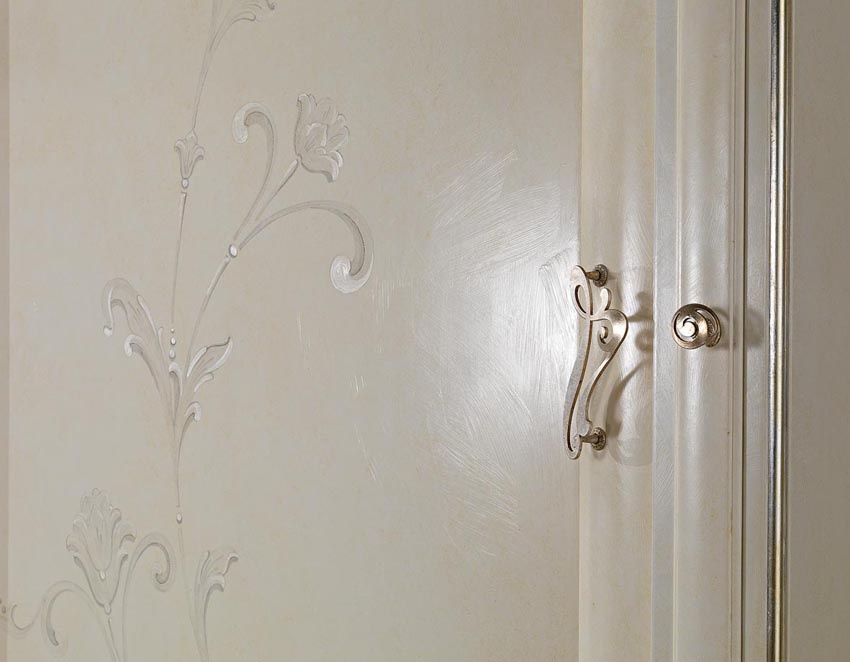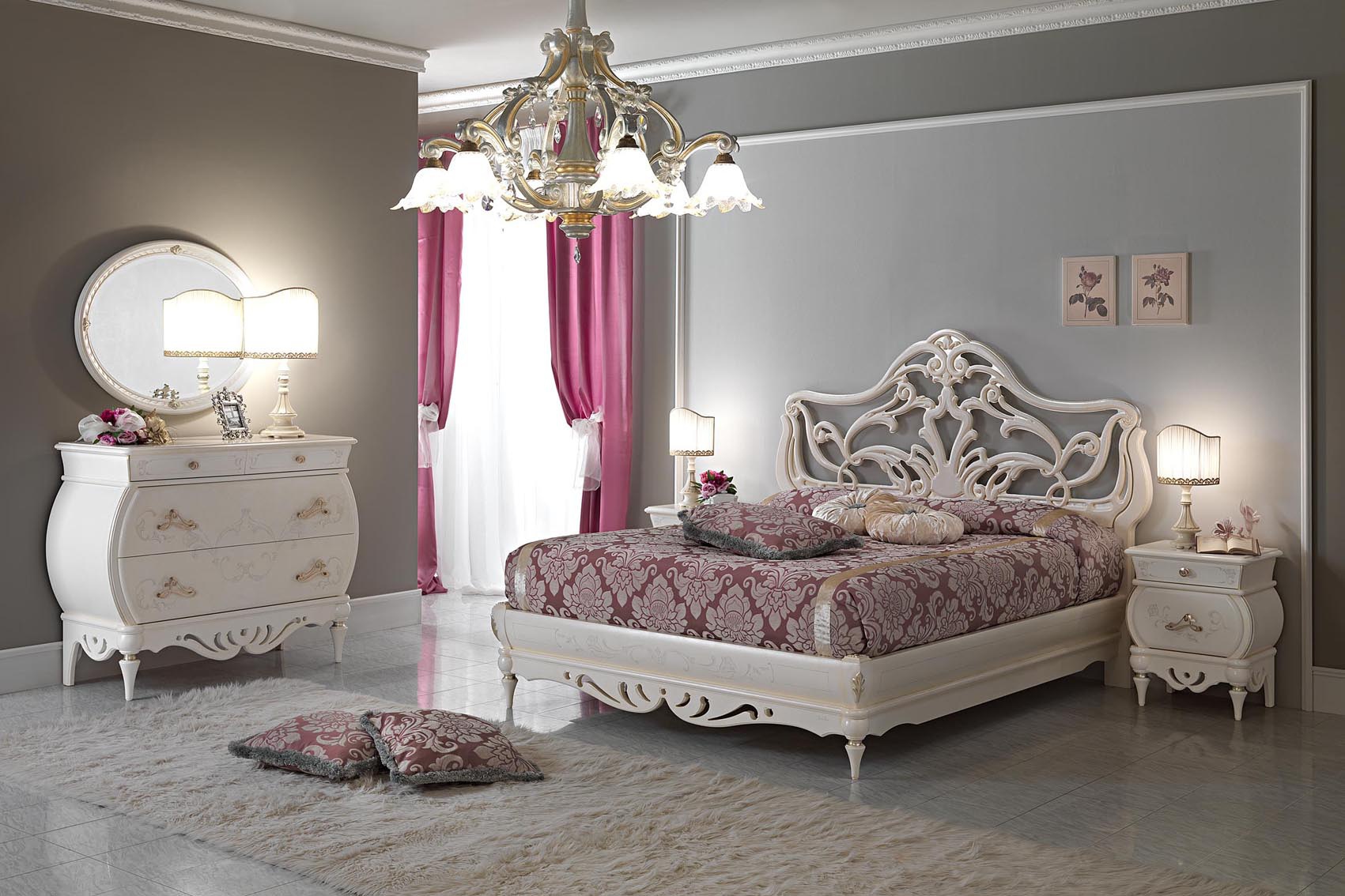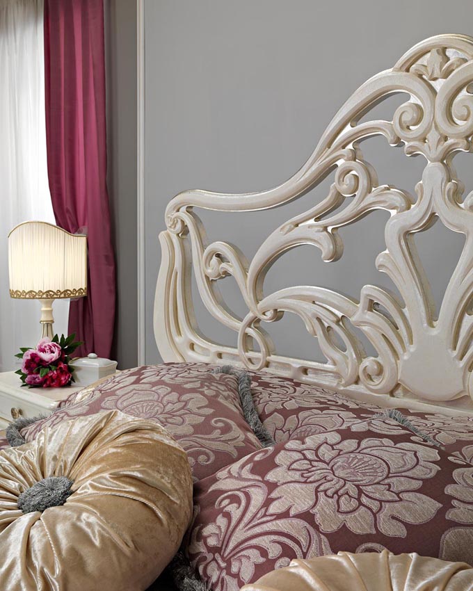 Headsets for bedrooms from Italian manufacturer Pistolesi. Set includes double bed, bedside tables, wardrobe and chest of drawers. The furniture is made of solid wood of valuable breeds. Upholstery - textiles from a range of campaigns. Finish options: lacquer/gold plated. The design of complementary decorative pillows different shapes. Set is decorated with inlay. Fittings - gilding. A wardrobe with drawers. The color of products is white.