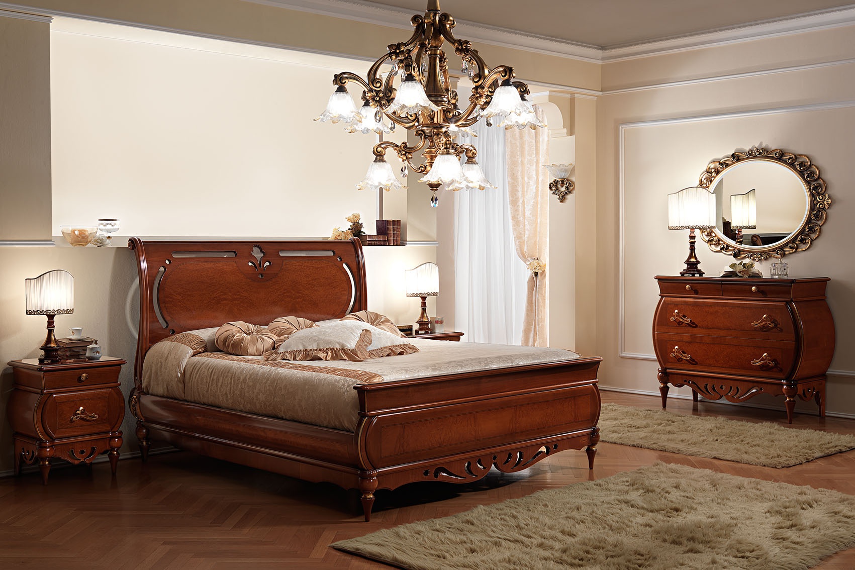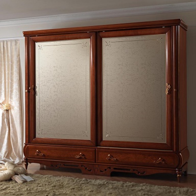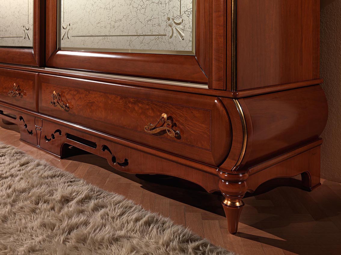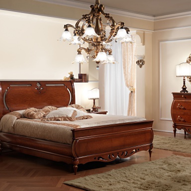Headsets for bedrooms from Italian manufacturer Pistolesi. Set includes double bed, bedside tables, wardrobe and chest of drawers. The furniture is made of solid wood of valuable breeds. Finish - gloss lacquer from the range of the campaign. The design of complementary decorative pillows different shapes. Fittings - gilding. The color of natural wood products.