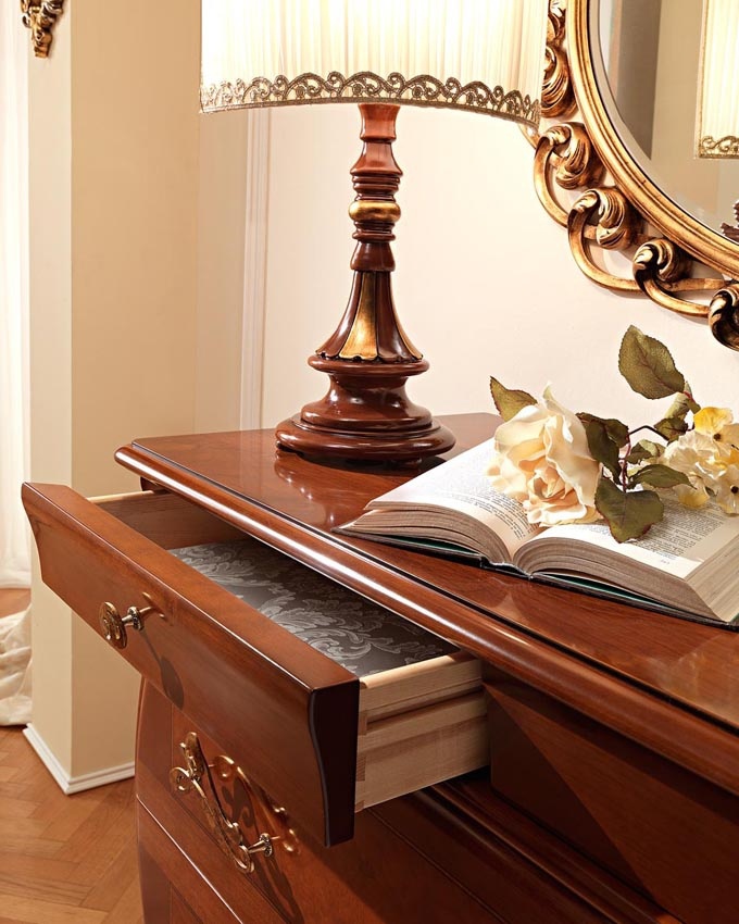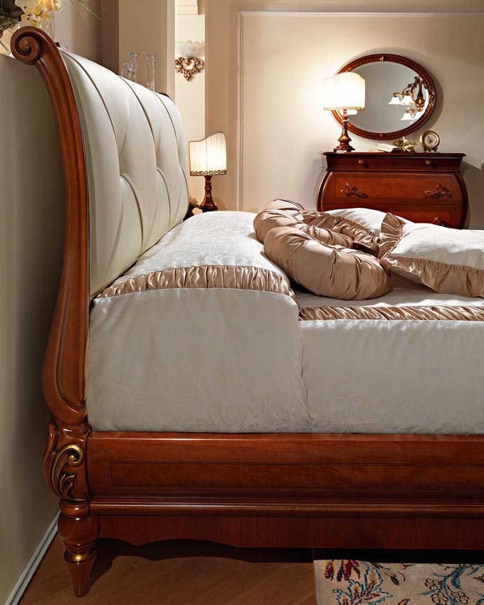 Headsets for bedrooms from Italian manufacturer Pistolesi. Set includes double bed with high headboard and a soft, bedside tables and chest of drawers. The furniture is made of solid wood of valuable breeds. Finish - gloss lacquer from the range of the campaign. The design of complementary decorative pillows different shapes. Fittings - gilding. The color of natural wood products.