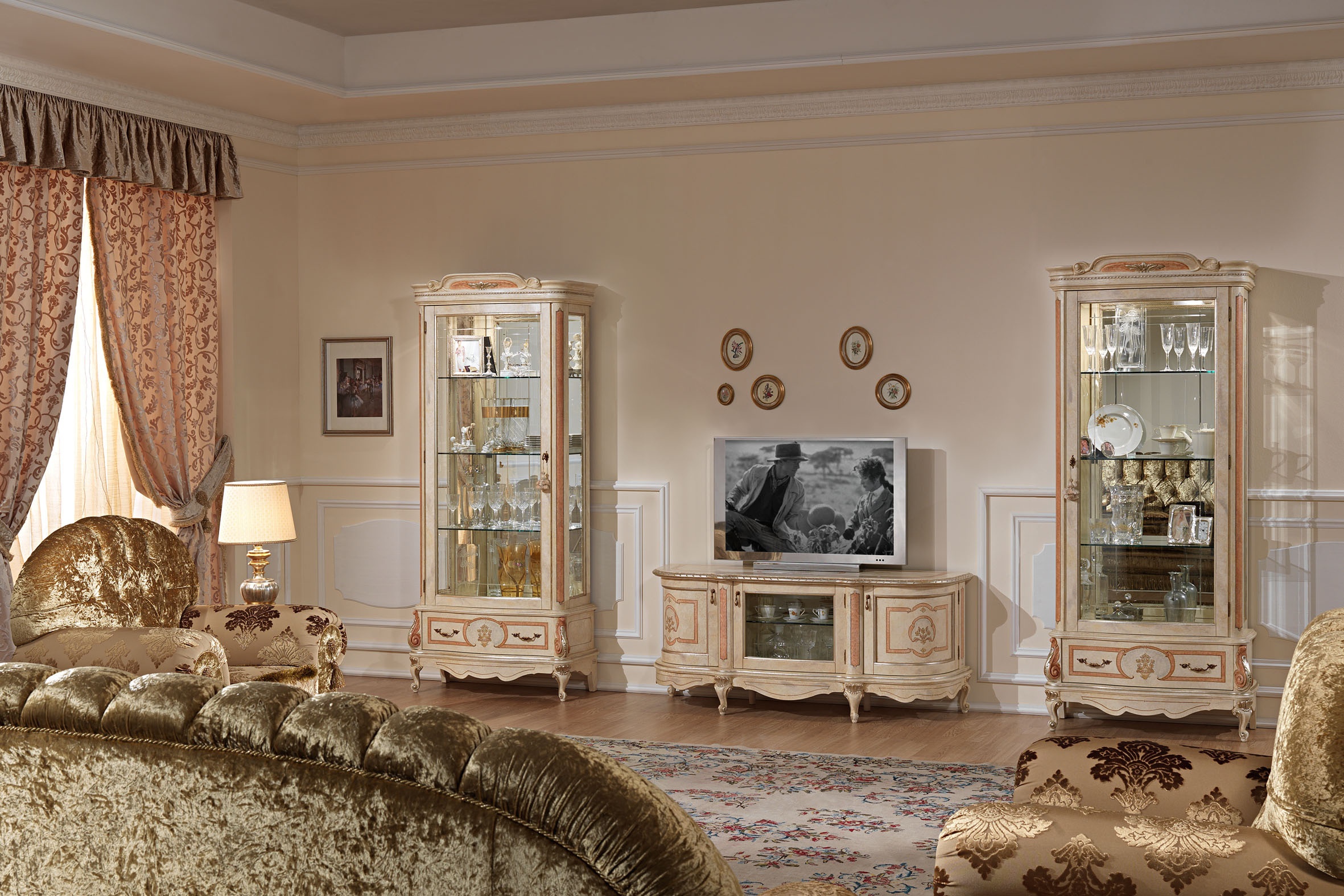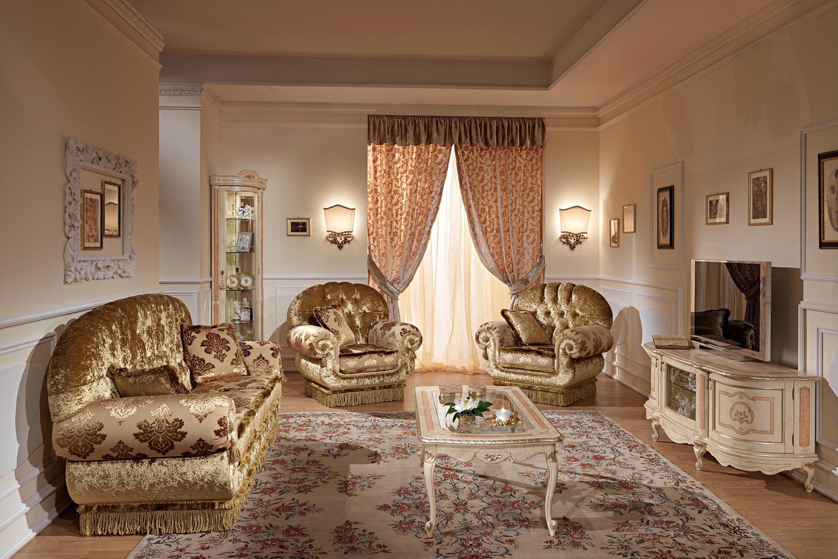 Sofa set from the Italian manufacturer Pistolesi. Set includes three seater sofa, two armchairs, coffee table, showcase and Cabinet for TV. The furniture is made of solid wood of valuable breeds. Upholstery - textiles from a range of campaigns. The base of the sofa and armchairs hidden by a decorative "skirt". Doors and shelves glass. D?cor - gilding. Set is decorated with inlay. Colors: Golden, ivory.