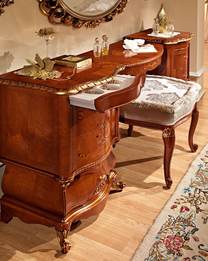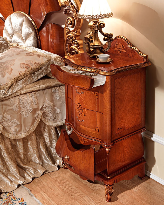 Headsets for bedrooms from Italian manufacturer Pistolesi. Set includes double bed with high headboard, bedside tables, dressing table and chair. The furniture is made of solid wood of valuable breeds. Upholstery - textiles from a range of campaigns. Decorative accessories - metal. Finishes - carved/gloss varnish. D?cor - gilding. Set is decorated with inlay. The design of complementary decorative pillows different shapes. The color of natural wood products.
