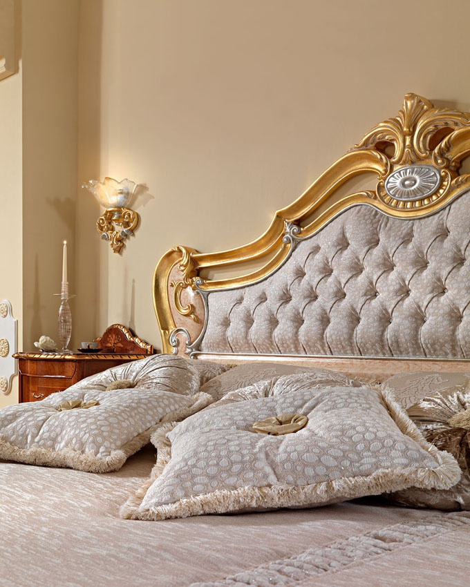 Headsets for bedrooms from Italian manufacturer Pistolesi. Set includes double bed with high headboard and soft, chest of drawers, bedside tables, a chair and a mirror. The furniture is made of solid wood of valuable breeds. Upholstery - textiles from a range of campaigns. Decorative accessories - metal. Finish options: white lacquer/gilding. Set is decorated with inlay. The design of complementary decorative pillows. Colors: white, natural wood color.