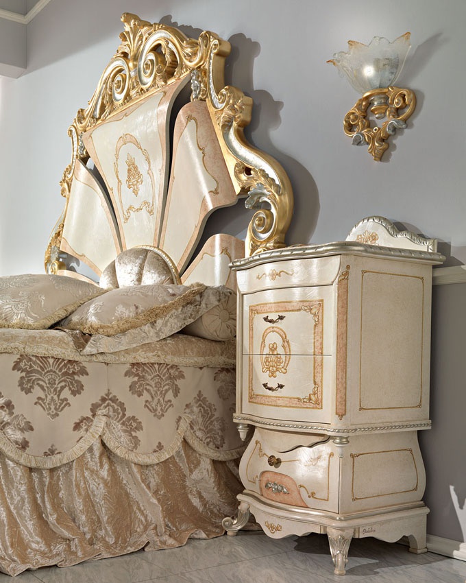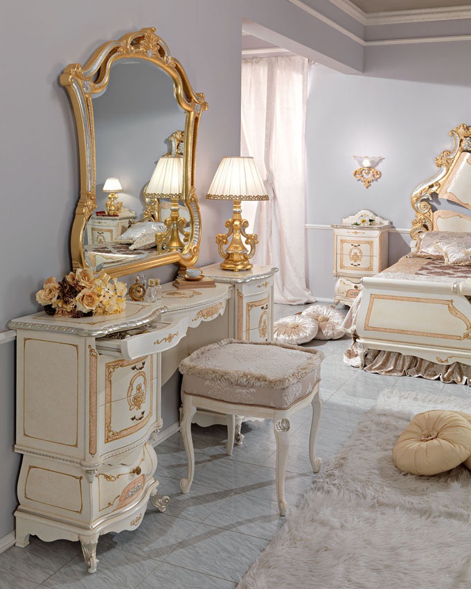 Headsets for bedrooms from Italian manufacturer Pistolesi. Set includes double bed with high headboard, chair, dressing table, two bedside tables and a wardrobe. The furniture is made of solid wood of valuable breeds. Upholstery - textiles from a range of campaigns. Decorative accessories - metal. D?cor - gilding. The finish is white lacquer. Set is decorated with inlay. The design of complementary decorative pillows different shapes. Colours in stock.