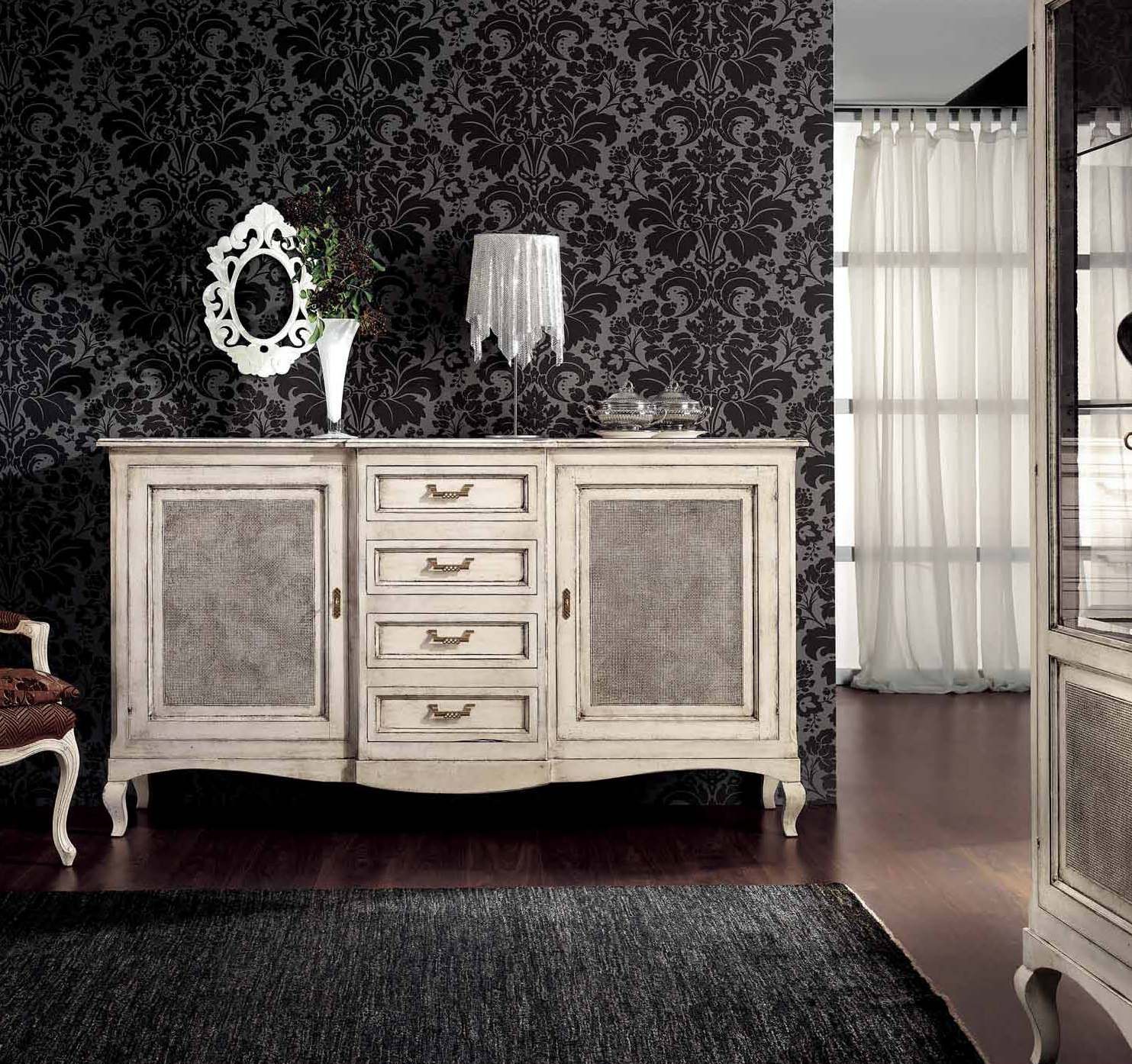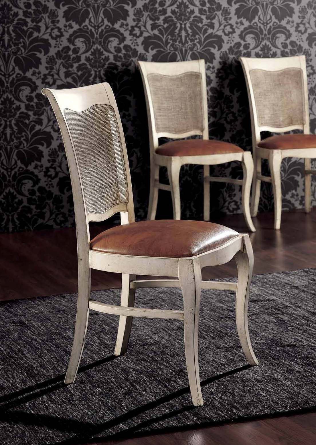 Set for the dining room from Italian manufacturer Villanova. Set includes dining table, chairs, dresser and sideboard. The furniture is made of natural wood. Doors and drawers of the sideboard - glass. Decorative accessories - metal. Upholstery chairs - leather. Finish - antiqued/Polish. The color of products is white.