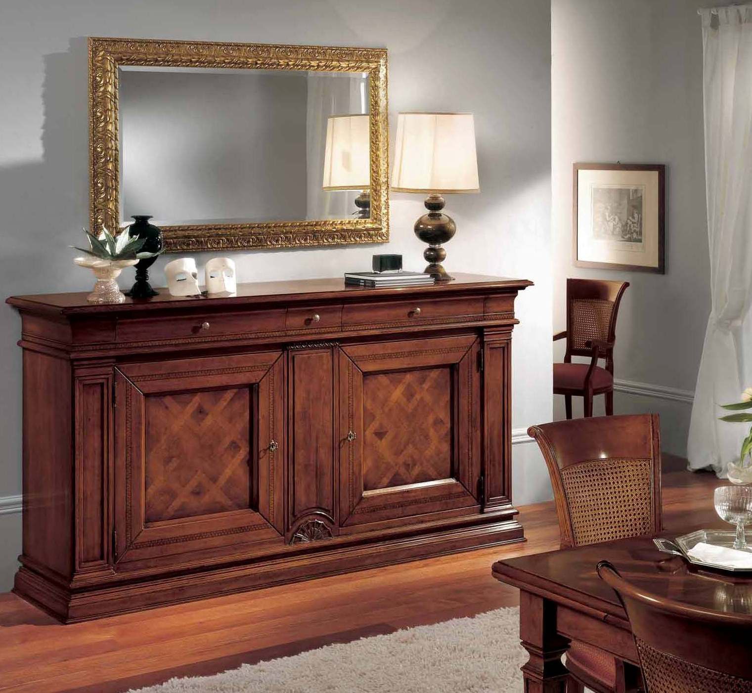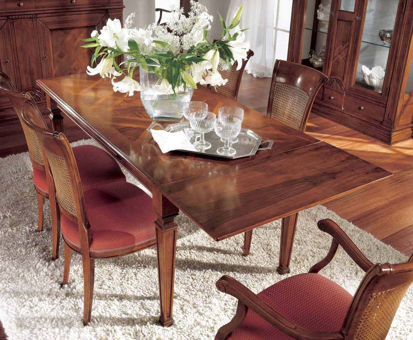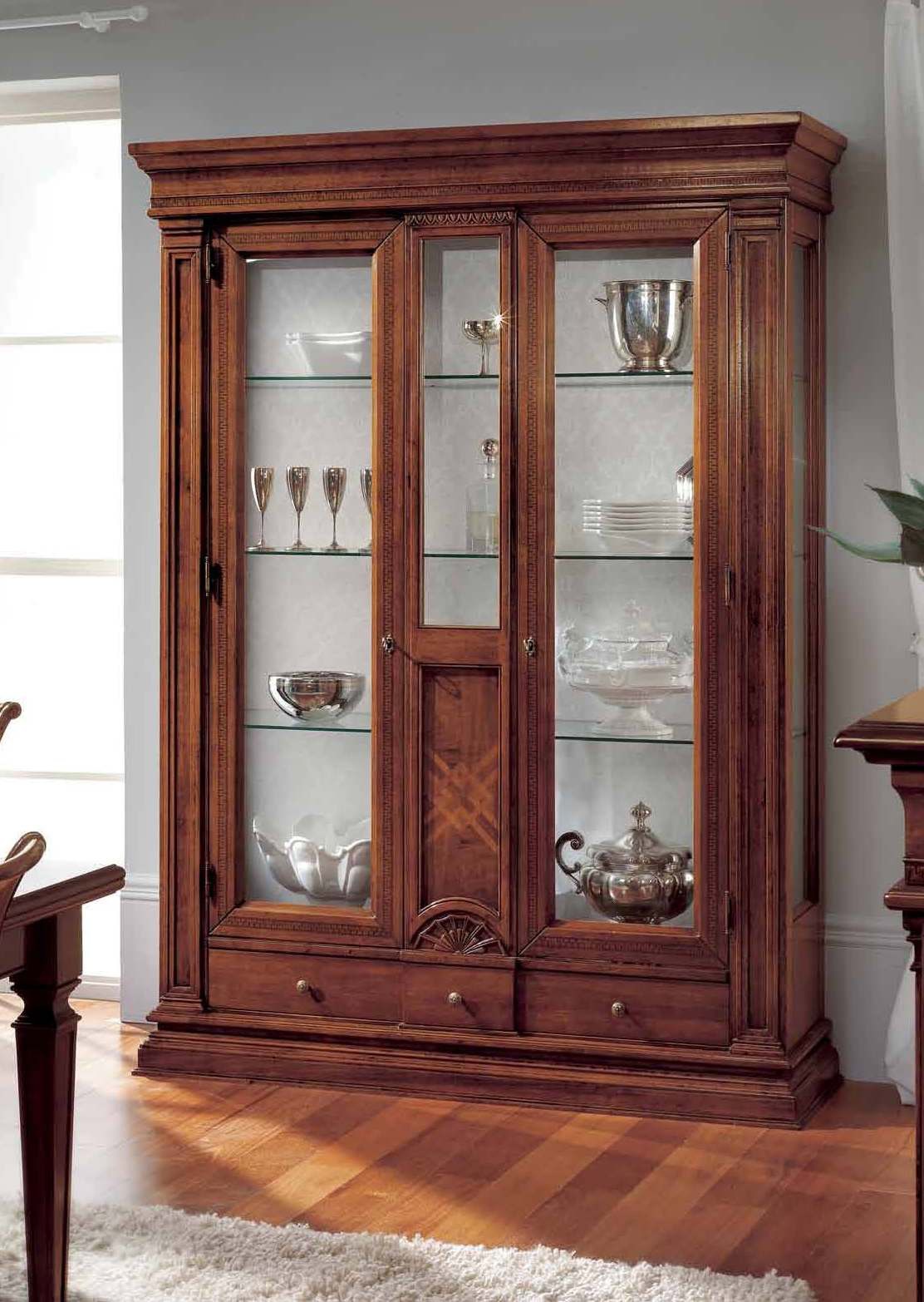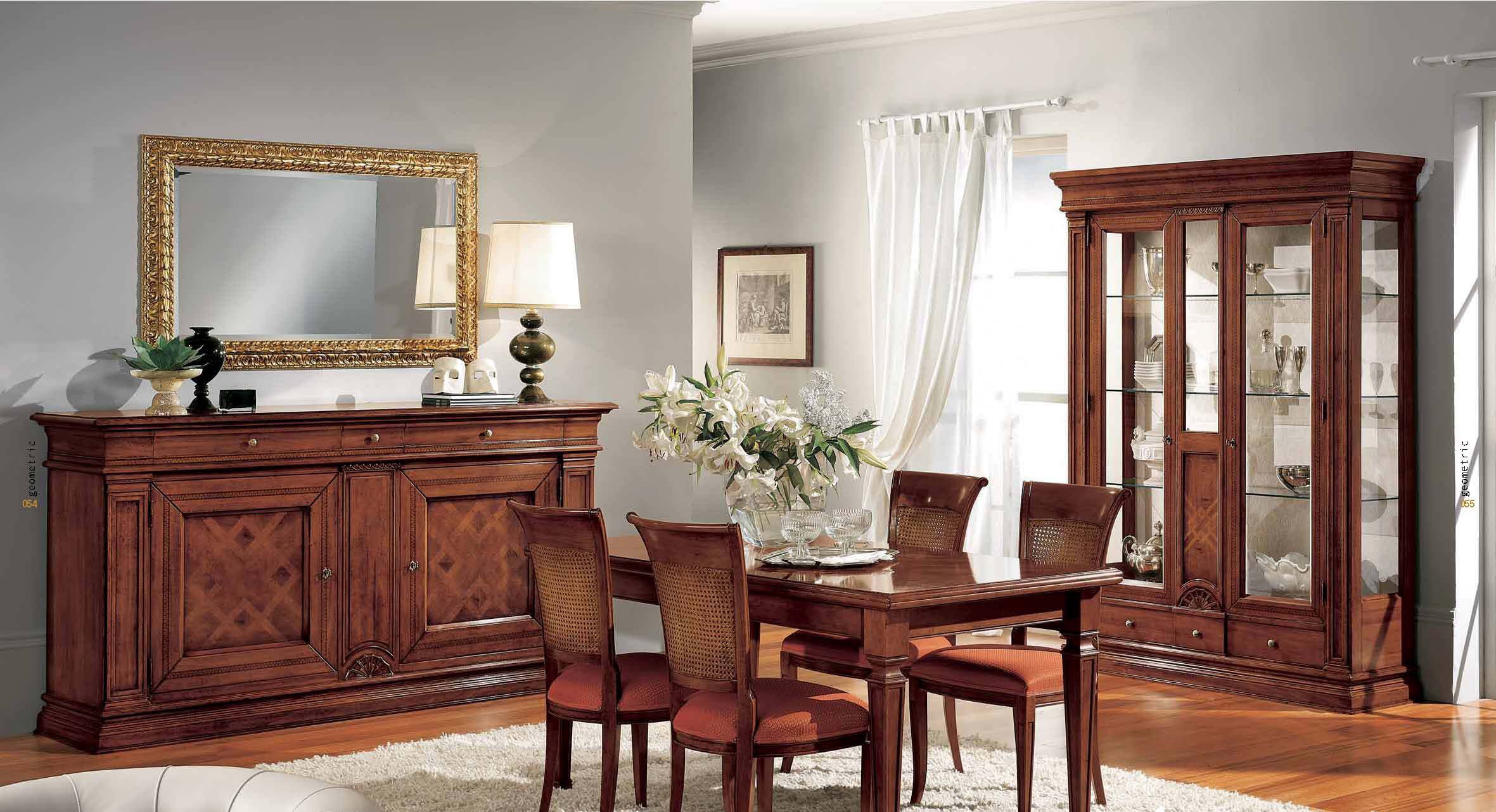Set for the dining room from Italian manufacturer Villanova. Set includes dining table, chairs, cupboard and sideboard. The furniture is made of natural wood. Shutters and shelves of the sideboard - glass. The upholstery of the chairs genuine leather or textiles from a range of campaigns. Finish - gloss lacquer. Sideboard with drawers. The color of natural wood products.
