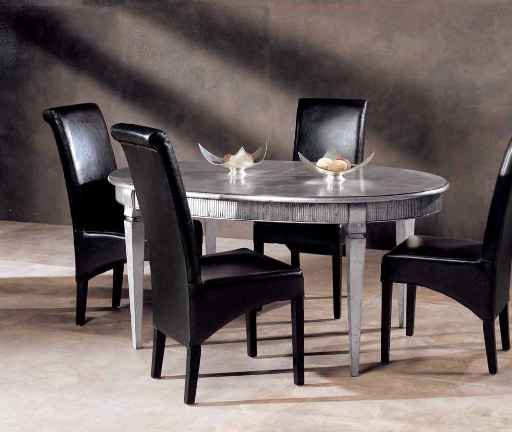 Set for the dining room from Italian manufacturer Villanova. Set includes oval table and chairs with a high back. The furniture is made of natural wood. Upholstery chairs - leather. Finishing varnish from the range of the campaign. Colors: silver, black.