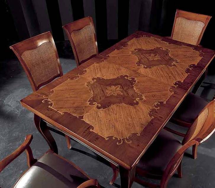 Set for the dining room from Italian manufacturer Villanova. Set includes dining table and chairs with armrests. The furniture is made of natural wood. Padded seat chairs are upholstered in leather. Finishing varnish from the range of the campaign. The table is decorated with inlay. The color of natural wood products.