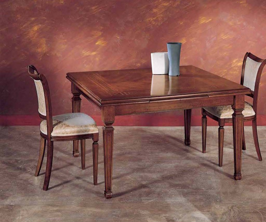 Set for the dining room from Italian manufacturer Villanova. Set includes dining table and rectangular chairs with upholstered seat. The furniture is made of natural wood. Upholstery - textiles from a range of campaigns. Colors: white, natural wood color.