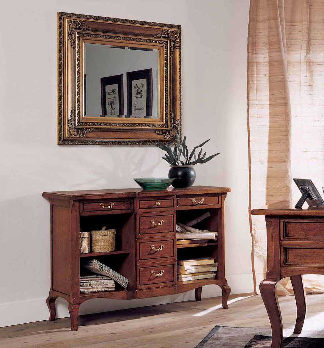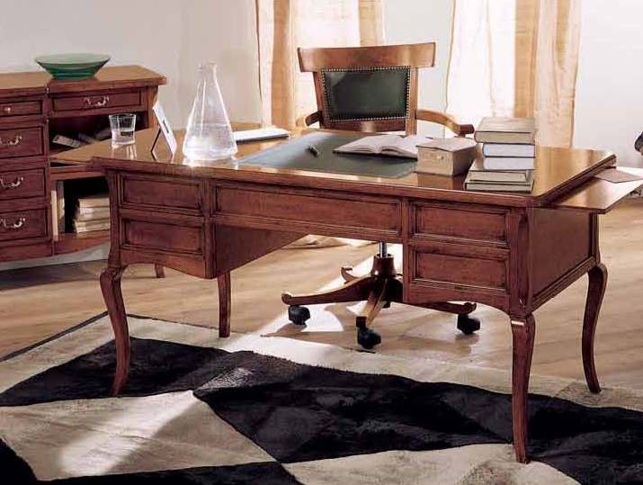 Headsets for the office from the Italian manufacturer Villanova. Set includes a Desk, chair and bookcase. The furniture is made of natural wood. Upholstery - leather. A chair on wheels. Decorative accessories - metal. Finishing varnish from the range of the campaign. The color of natural wood products.