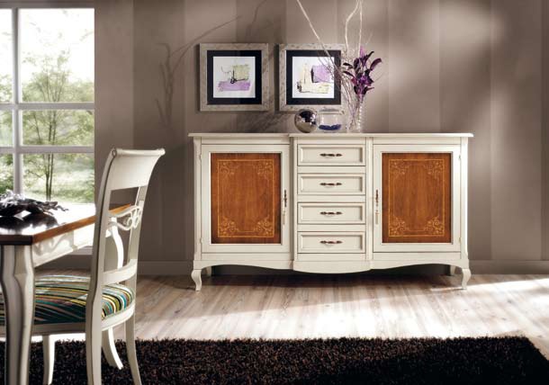 Set for the dining room from Italian manufacturer Villanova. Set includes sideboard and cupboard. The furniture is made of natural wood. Shutters and shelves - glass. Finishing varnish from the range of the campaign. Decorative accessories - metal. Set is decorated with inlay. Colors: white, natural wood color.