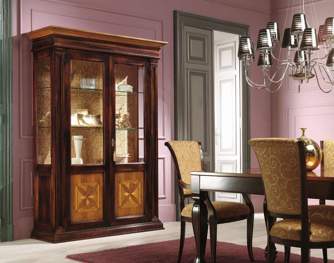 Set for the dining room from Italian manufacturer Villanova. Set includes sideboard and cupboard. The furniture is made of natural wood. Shutters and shelves - glass. Finishing varnish from the range of the campaign. Decorative accessories - metal. Set is decorated with inlay. Colours in stock.