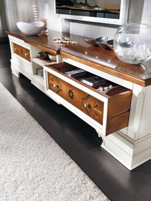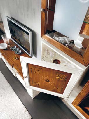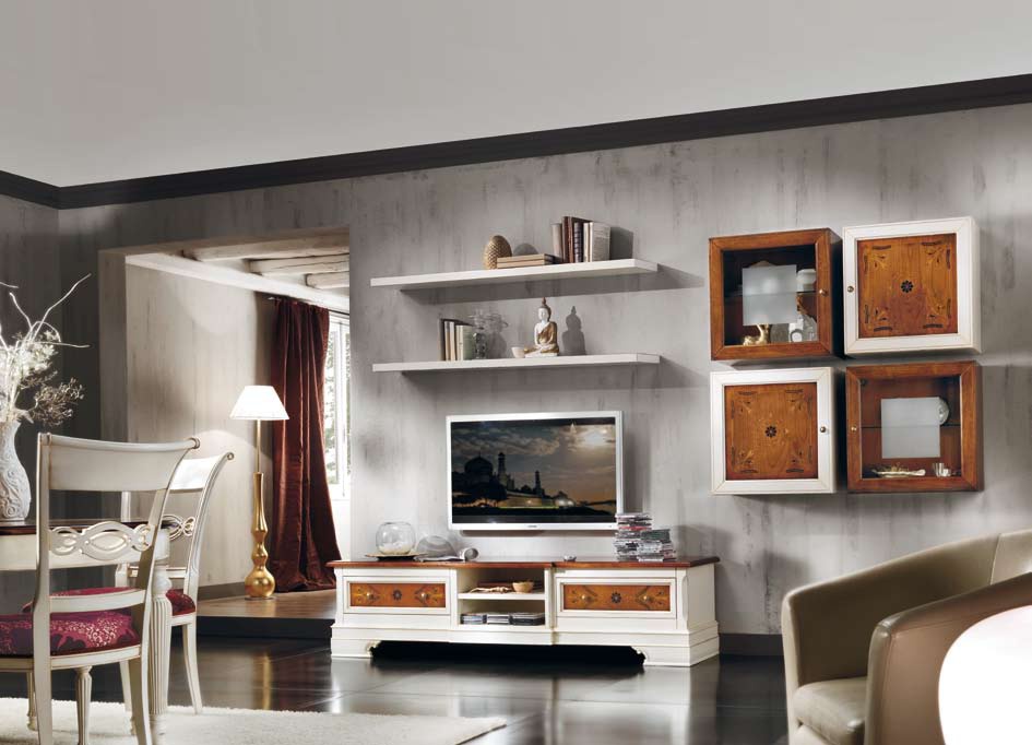 Modular storage system from Italian manufacturer Villanova. The furniture is made of natural wood, casement - glass. Wall for TV and books decorated with inlay. A great choice for the living room in a classic style. Colors: white, natural wood color.