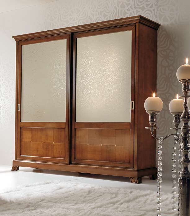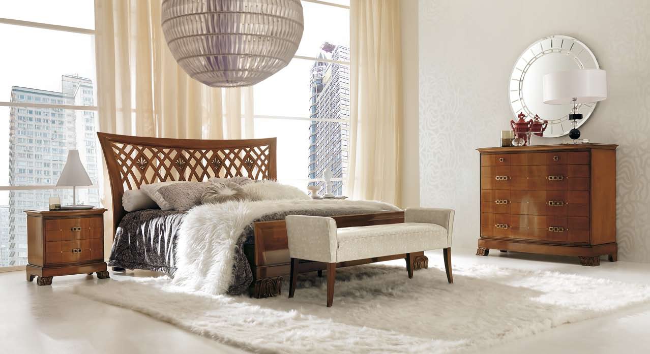 Headsets for bedrooms from Italian manufacturer Villanova. Set includes double bed with high headboard, bedside tables, chest of drawers and wardrobe. The furniture is made of natural wood. Finish - gloss lacquer. Handles - metal. Sash - glass. The color of natural wood products.