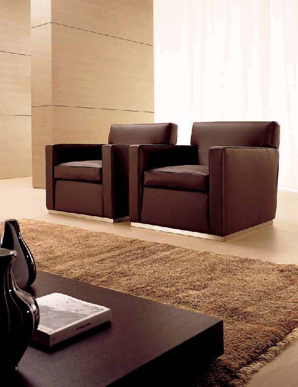 A chair from the Italian manufacturer Desiree. Model with a square backrest and armrests. Seat cushion is removable. The body is made of solid wood. Base in chromed metal. Two upholstery options from leather or textile. The color of this model is brown. The model is made in a modern style.