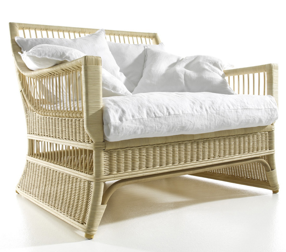 The Champagne bar sofa from Italian manufacturer Vittorio Bonacina. The frame is made of rattan, filler - foam, upholstery - textiles from a range of campaigns. A chic model for the living room or terrace. The product is of a romantic and stylish look. The design of complementary decorative pillows. Colors: white, natural wood color.