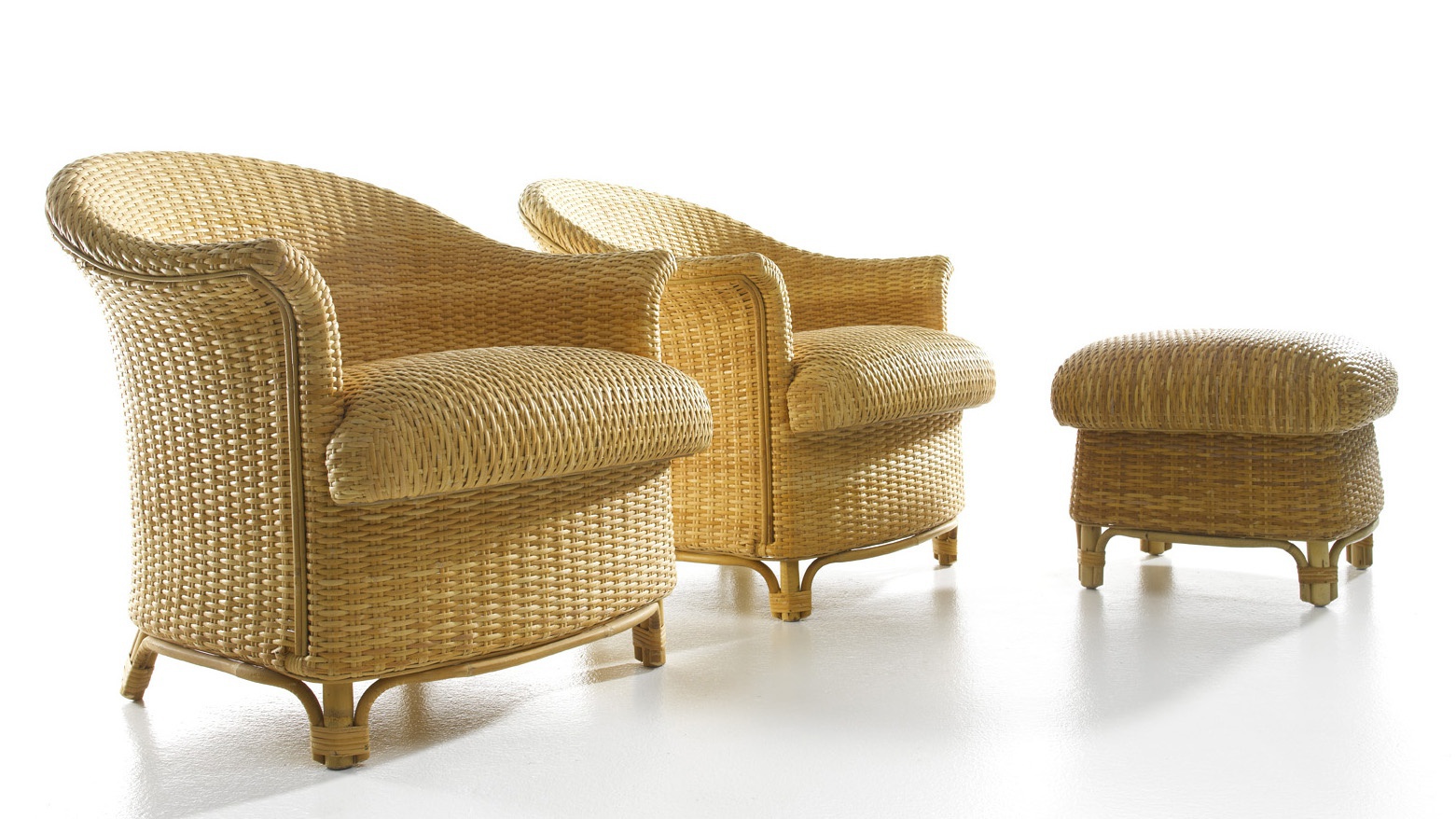 Fidia chair from the Italian manufacturer Vittorio Bonacina. The frame is made of rattan. The set includes a stool for the feet. The model is designed for the living room in a colonial style. Product color natural wood.