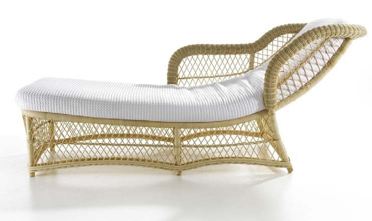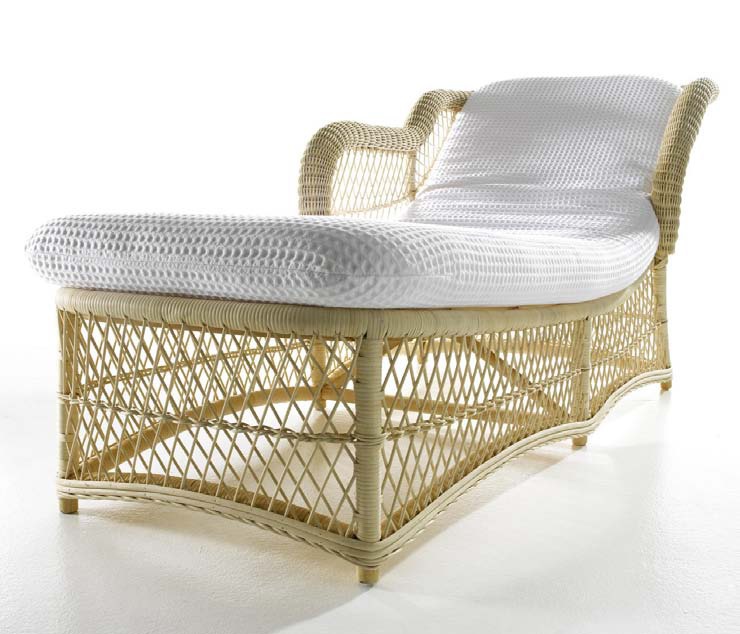 Deck chair from the Italian manufacturer Vittorio Bonacina. The frame is made of rattan. Upholstery - textiles from a range of campaigns. The model is decorated with old furniture in colonial style. Colors: white, natural wood color.