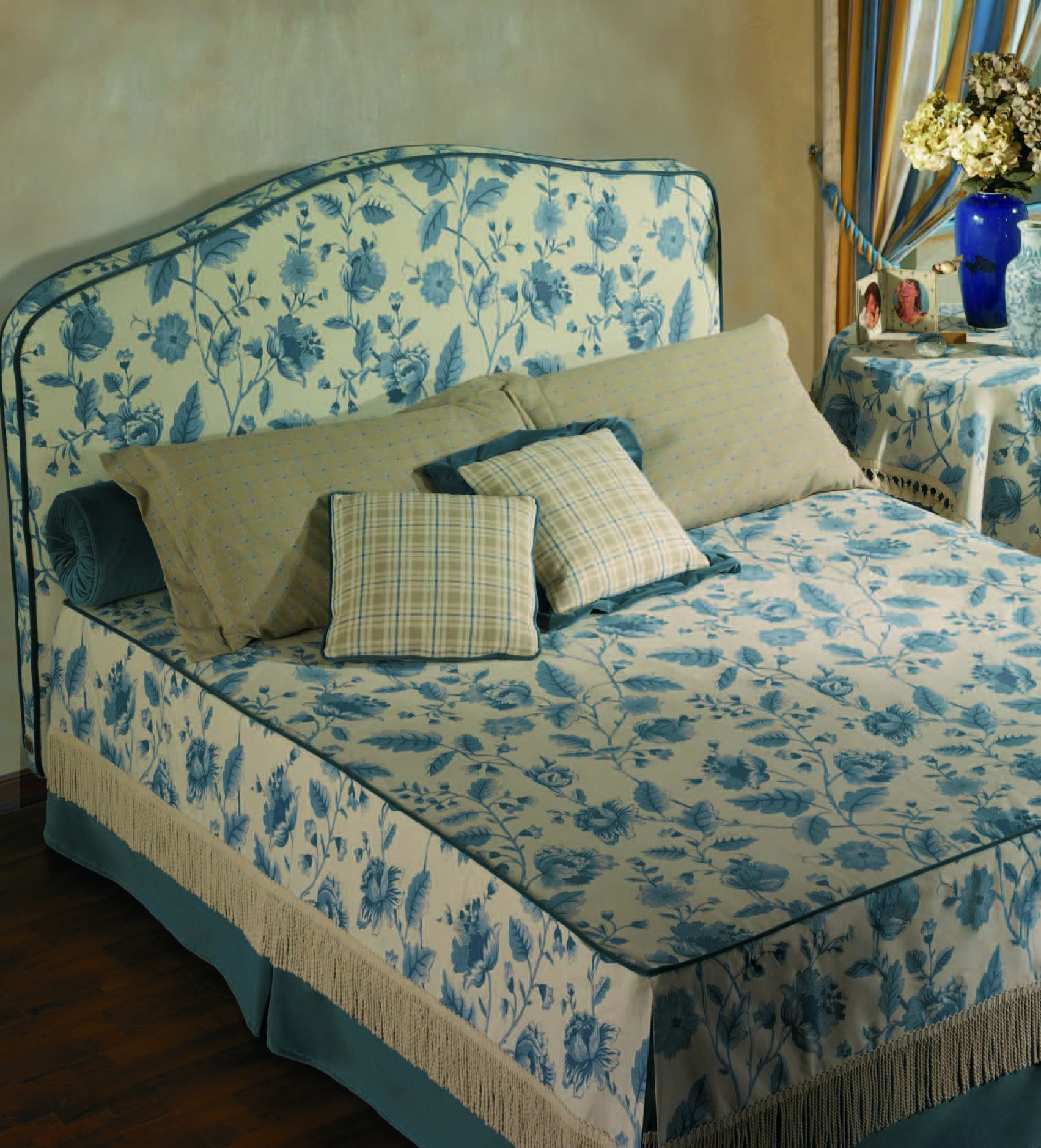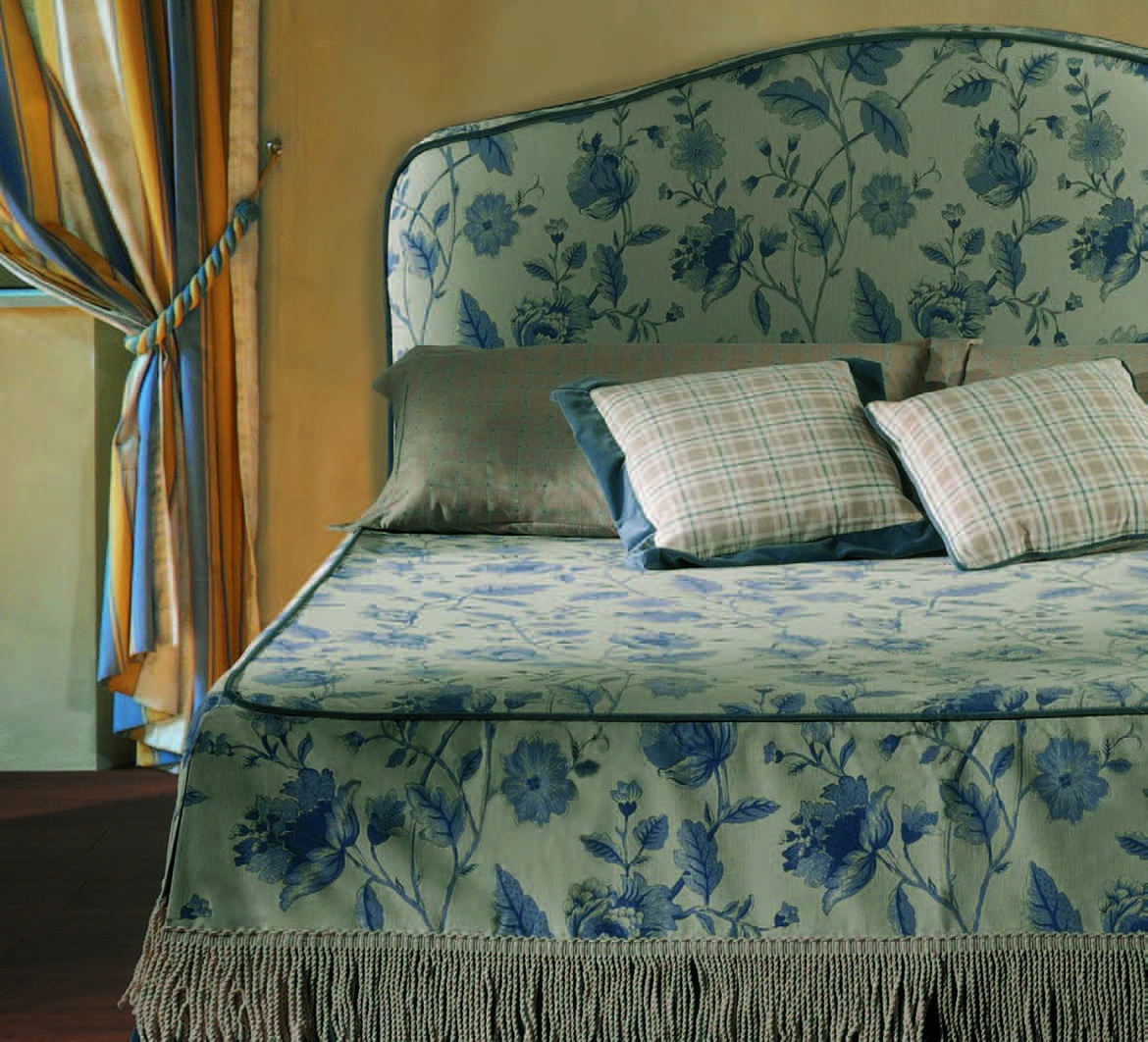 Double bed in classical style, from the Italian manufacturer Treci Salotti. Upholstered headboard has an arched edge. Colours in stock. The frame is made from solid wood, upholstery - textiles. The model will add to your design and comfort.
