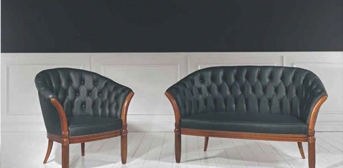 Sofa set from the Italian manufacturer-Seven sedie perfectly. Set includes two seater sofa with high back and seat. The furniture is made of solid wood, upholstery leather. Set in a classic style. Colors: black, natural wood color.