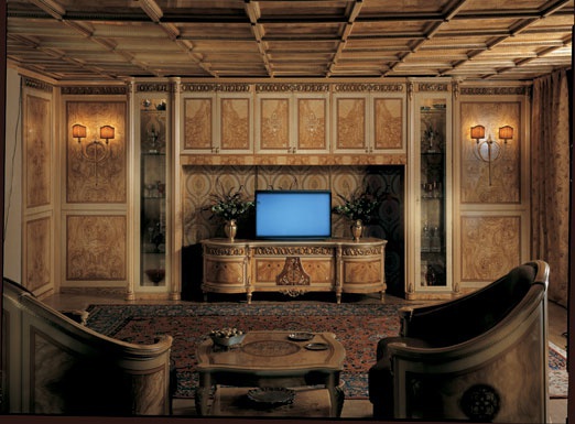 Modular storage system from Italian manufacturer Socci Anchise. The frame is made of solid wood of valuable breeds. Shutters and shelves - glass. The wall is adorned with decorative carvings and inlays. The elements - gold plated/handmade. Model for books and TV. A chic choice for the living room in the Rococo style. Colours in stock.