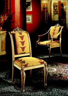 Set for the dining room from Italian manufacturer Socci Anchise. Set includes round table and chair. The furniture is made of solid wood of valuable breeds. The decorations are handmade and covered with gold. Set is decorated with inlay. The upholstery - textiles from a range of campaigns. Colours in stock.