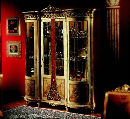 Showcase from Italian manufacturer Socci Anchise. The frame is made of solid wood of valuable breeds. Shutters and shelves - glass. Finish options: carved/Polish/gold plating. The model is handmade. Showcase decorated with inlay. A wonderful choice for the dining room in the Rococo style. Colours in stock.