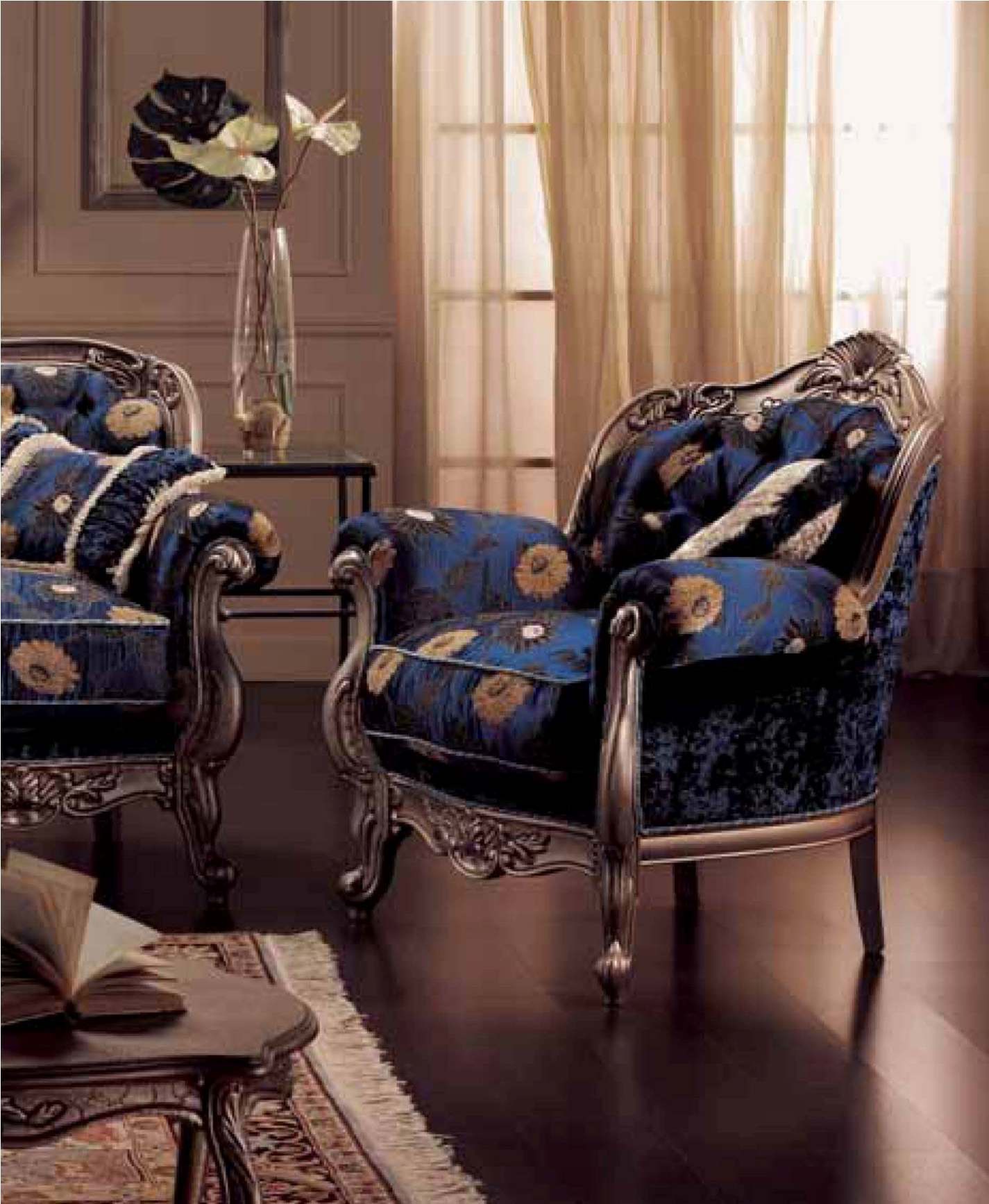 Armchair in fabric Italian manufacturer Linea Due. The Seating is made on a frame of wood. The legs and the lower part is varnished. Upholstery made of high-quality textile dark blue. Perfect for modern living.