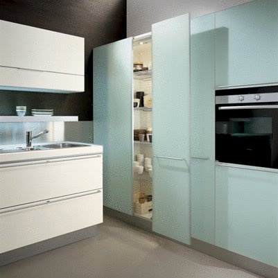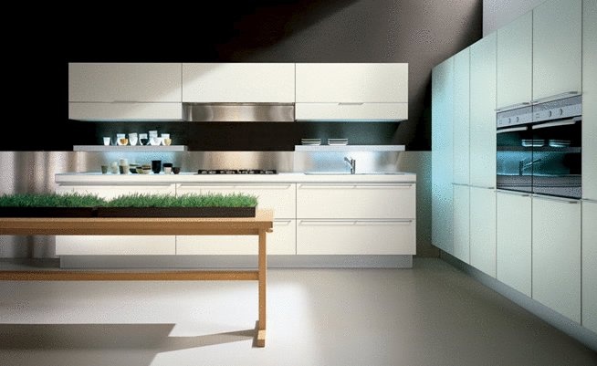 Set for the kitchen Seventy from the Italian manufacturer Ernestomeda. The model is made in modern style. Facades are blank and glazed. Finish to choose from a collection company. Handles made of chromed metal. The table top is covered with natural kamnem or stainless steel. The model perfectly fits and decorate the interior of your home.