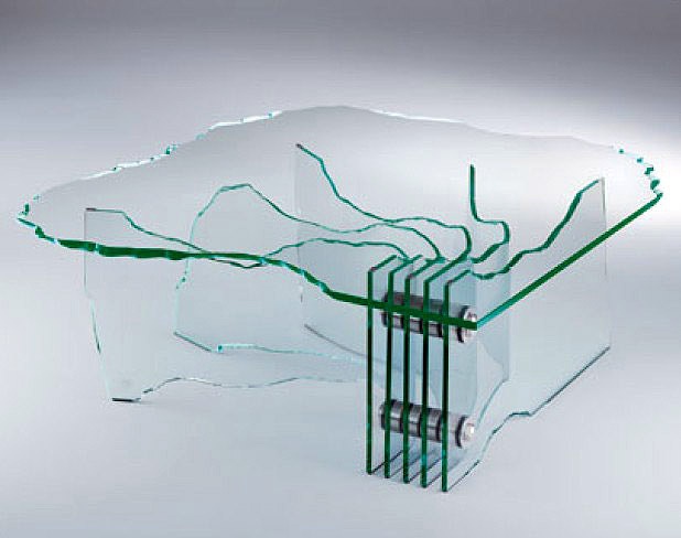 Shell coffee table from the Italian manufacturer Fiam. Model with shaped top made of transparent glass. The massive base consists of glass plates. Decorative accessories made of metal. The model has a original design. Fully handmade. Table is made in a modern style.