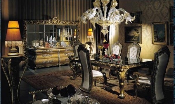 Dining room (dining set) from the Italian manufacturer Cappelletti. The set consists of: dining table, sideboard stoleti. Frames made of solid wood. Finish offered a Golden color. The table top is made of transparent glass. Chairs with vysokoy spinkai performed with or without armrests. Accessories metal. Set decorative hand carved.