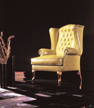Chair high back Big Ben Italian manufacturer Pigoli. Armchair with soft, rounded armrests. Model wooden frame, upholstered with natural leather. The proposed color scheme in yellow version. A style classic.