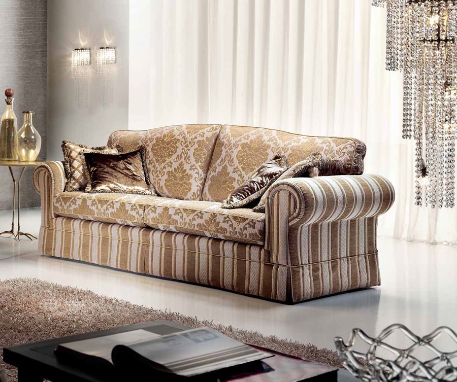The Ascot sofa from Italian manufacturer Cava. The frame is made of wood. Upholstery - textiles from the company portfolio. The armrests are wrapped. They are decorated with decorative pillows and brushes. Sofa in classic style.