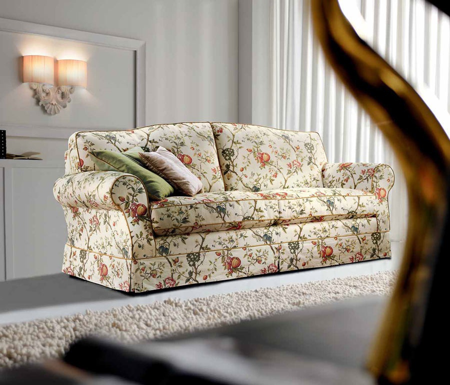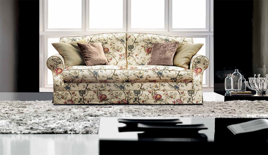 The Paris sofa from Italian manufacturer Cava. The frame is made of wood. Upholstery - textiles from a range of companies with a vegetative ornament. The design of complementary decorative pillows. The armrests are wrapped.