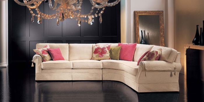 Ritz modular sofa from Italian manufacturer Cava. The frame is made of wood. Upholstery - textiles from the company portfolio. They are decorated with decorative pillows and hands on the armrests. Sofa in classic style.