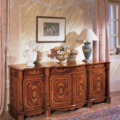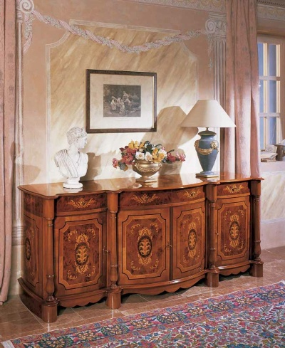 A chest of drawers from Italian manufacturer Stile Elisa. Includes sections with hinged doors and drawers. The frame is made from solid wood. The surface is covered with a glossy varnish. Accessories metal. The ornament serves as a decorative thread.