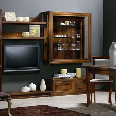 Modular storage system from Italian manufacturer Premobil. The system is designed for TV. Equipped with shelves, closed cabinets and glass with a specially designated place to install the TV. Made in natural wood color, varnished. The perfect solution for modern interior.