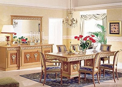 Dining room (dining set) from the Italian manufacturer Cenedese, collection Atlanta. Set includes: table, chairs in fabric, sideboard. The frame is made from solid wood, tamburino. Finish options: aged or dyed veneer with a brush. The model is decorated with gilded carving.