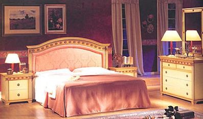 Bedroom (Suite bedroom) from the Italian manufacturer Cenedese, collection Chicago. Set includes: double bed, bedside tables, chest of drawers, wall mirror. Frames made from solid wood, tamburino. Finish: antiqued and painted with a brush veneer Model akrasia gilded carvings.