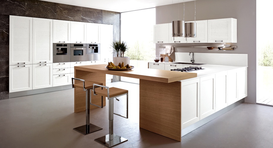 Corner kitchen from the Greta collection from the Italian manufacturer Zaccariotto Cucine. Comfortable and functional kitchen in a minimalist style. Made of solid wood varieties, laminate and metal. Colours in stock. The boxes are equipped with system provide silent and smooth closing.