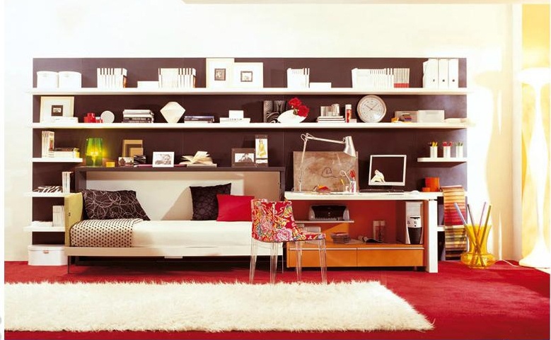 The rack, from the Italian manufacturer Clei. The model is made with element that becomes a sofa. Stand perfectly dopolnyaet Desk. Colors: brown, white, orange.