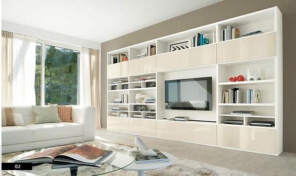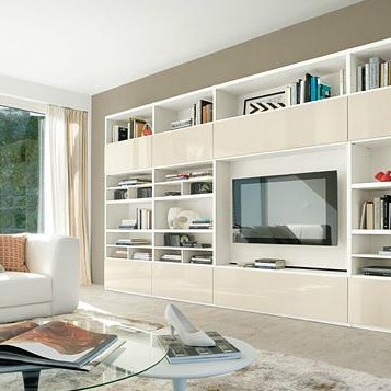 Modular system from Italian manufacturer Colombini. The frame is made of wood. The model consists of open, closed sections and special areas for large screen TVs. Finish - gloss and matte varnish from a range of companies. The model is made in modern style.