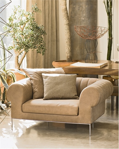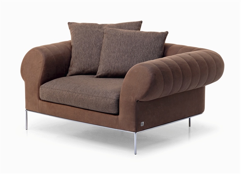 The Deja Vu chair Armchair from Italian manufacturer Busnelli. Model on thin chrome legs and frame. The frame is made of metal and wood. Upholstery choice of fabric or leather. Filler seat cushions 70% goose down, 30% duck feathers and polyurethane foam. The elasticity of the seat attach with elastic straps and springs. In addition offered are decorative pillows of different sizes. Colors offered a choice from a range of companies. A great solution for your living room in modern style.