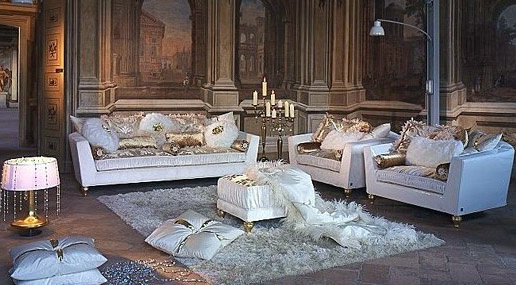 Sofa set from the Italian manufacturer Busnelli. Consists of double sofa, two armchairs and pouf. Material - solid wood. Legs are figured the forms covered in gold leaf. The upholstery is available from textile or leather. The elasticity of the seat springs and attach with elastic straps. The model is decorated with decorative pillows and cushions. Set made in a classic style.