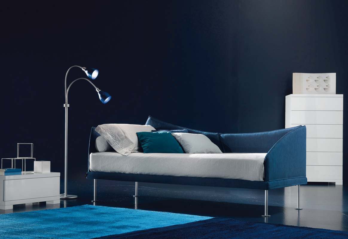 Onde bed from Italian manufacturer Axil. The legs are made of metal, upholstery - cloth from a range of campaigns. A single model for modern interiors. The design of complementary decorative pillows and cushions. Colors: white, blue.